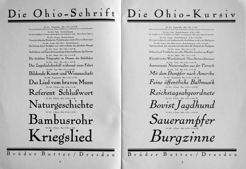 Obwohl die Pabst Oldstyle in einer etwas disziplinierteren deutschen Belegung unter der Bezeichnung Ohio auf den deutschen Markt kam und seit 1912 von der Dresdner Gießerei Brüder Butter/Schriftguss AG Dresden geschnitten wurde, setzte man für die Bauhaus-Werbeschrift die deutlich sperrigere amerikanische Vorversion ein. Das war äußerst mühsam, da an vielen Stellen improvisiert werden musste. So fanden doppelte Kommata als An- bzw. Ausführungszeichen Verwendung, das „ß“ musste anderen Schriften entnommen, diakritische Zeichen zur Erzeugung der im Englischen fehlenden Umlaute wurden von anderen Schriften einzeln abgefeilt und an die Kleinbuchstaben angesetzt. Notwendig war das nicht, denn die Ohio-Schrift war 1919 schon recht verbreitet.