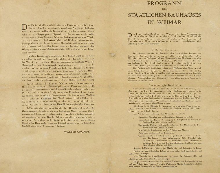 Im Ganzen erscheint das Innenleben des Faltblattes unharmonisch. Das Doppelblatt beinhaltet auf der linken Seite einen Manifesttext. Da auch hier eine Überschrift fehlt, wird uns das aber erst beim Lesen bewusst. Wir erfahren, dass es um eine neuartige Auffassung der Künstlerausbildung geht. Auf den folgenden Seiten drei und vier konkretisiert sich die Idee in einem Lehrprogramm. Aus der Großherzoglich Sächsischen Hochschule für bildende Kunst und der Großherzoglich Sächsischen Kunstgewerbeschule in Weimar soll ein sogenanntes „Bauhaus“ werden. Der Verfasser des Manifests erweist sich nicht nur als Prediger der Kunstschulreform, sondern auch als Direktor des neuen Instituts, wie wir auf Seite vier schließlich erfahren. Vielleicht erinnern wir uns an die kurze Meldung neulich in der Tageszeitung, welche die Übernahme des Direktorats vermeldete und den Namen des relativ unbekannten Berliner Architekten, Walter Gropius, erstmals nannte.