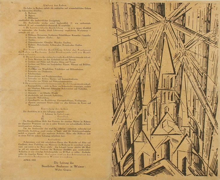 Ich fragte mich, wie das Flugblatt auf jemanden gewirkt haben mag, der noch nie etwas vom Bauhaus gehört hatte. Das dürfte bei seinem Erscheinen im Frühjahr 1919 der überwiegende Teil der möglichen Adressaten gewesen sein. Stellen wir uns also vor, Anfang Mai 1919 wird uns diese Werbeschrift in die Hand gegeben. Unsere Sehgewohnheiten sind durch Krieg, Novemberrevolution und Wahlkampfpropaganda durch Manifeste, Flugschriften und Wahlpropaganda verschiedenster Couleur an starke Bilder gewöhnt. Optisch sind wir nicht mehr so leicht zu beeindrucken. Das Titelblatt konfrontiert uns zunächst mit einer ganzseitigen, kristallinen Darstellung einer Kathedrale. Was wird hier angeboten? Eine Titelzeile, die diese Frage erhellen könnte, fehlt.