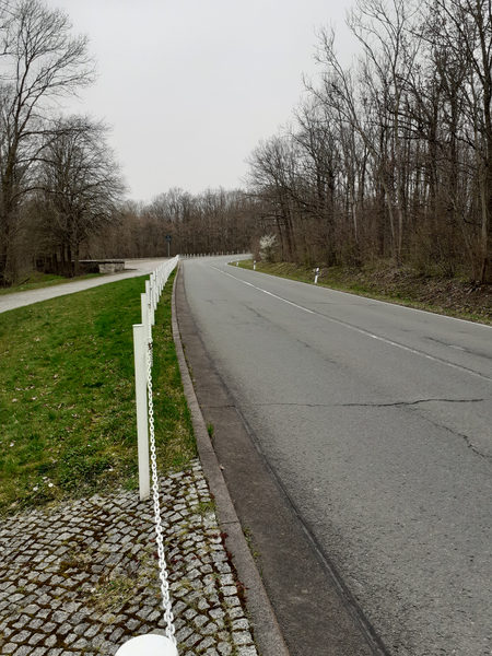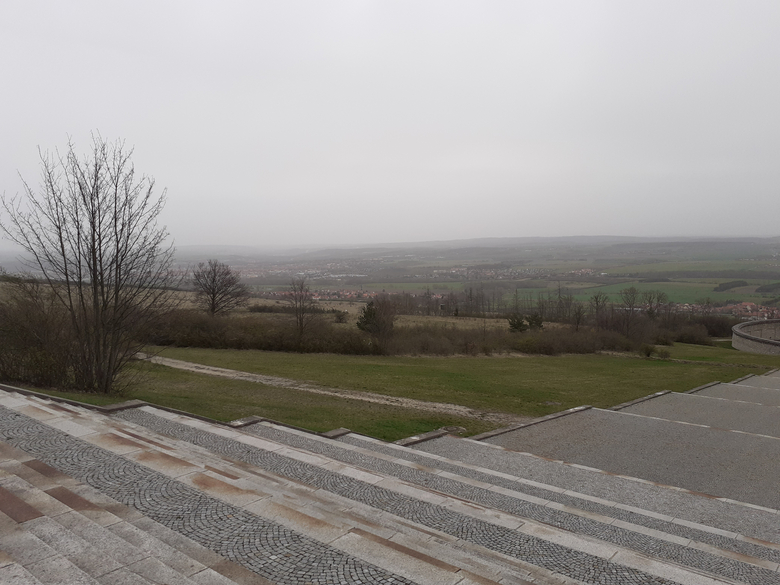 Die Aufnahmen des Zuges hat sie vermutlich von jenem Straßenabschnitt gemacht, der heute zwischen dem Gebäude, das die Ausstellung der Geschichte der Gedenkstätte beherbergt, und der Treppe verläuft, die zum Glockenturm herabführt. Die leicht abschüssige Kurve, die die Straße an dieser Stelle macht, erkennt man in ihren Bildern. Der Blick gen Weimar, den Miller fixierte, deckt sich weitestgehend mit dem von der Terrasse des Glockenturms und den umliegenden Stufen. Noch heute zeigen sich uns von dort die Kirche von Gaberndorf, die Bahnlinie nach Erfurt, dahinter Tröbsdorf und Teile der Innenstadt sowie dieselbe Hügelkette, die die Fotografin, aber auch die Teilnehmer des Begräbniszugs sahen.