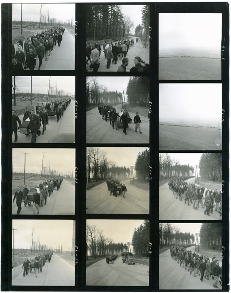 Der amerikanische Reporter Percy Knauth beschrieb die Szene eindrücklich: „Up that hill in the gathering twilight there came a long column of men, marching three abreast as silently, it seemed as shadows. It was a long, long line whose end we could not see. At its head were two coffins on little handcarts, covered with shining new French flags. These were two of the most recent dead among the French prisoners of Buchenwald. Behind them marched the living dead, heads bowed, feet scuffling up small clouds of dust, a thousand ghostly men to whom the fact of life had been a nightmare.”2 Auch Tage nach der Befreiung starben die entkräfteten ehemaligen Häftlinge weiter. Ihre Körper waren nicht mehr in der Lage, die Ihnen zugefügte Nahrung aufzunehmen. Diese Toten wurden von ihren Kameraden in namentlich gekennzeichneten Reihengräbern am Südhang des Ettersbergs bestattet.3 Einen solchen Beerdigungszug hielt Miller mit der Kamera fest. Einige der Männer schauten Sie direkt an. In ihren Gesichtern spiegeln sich Wut und Erschöpfung in gleichen Maßen.
