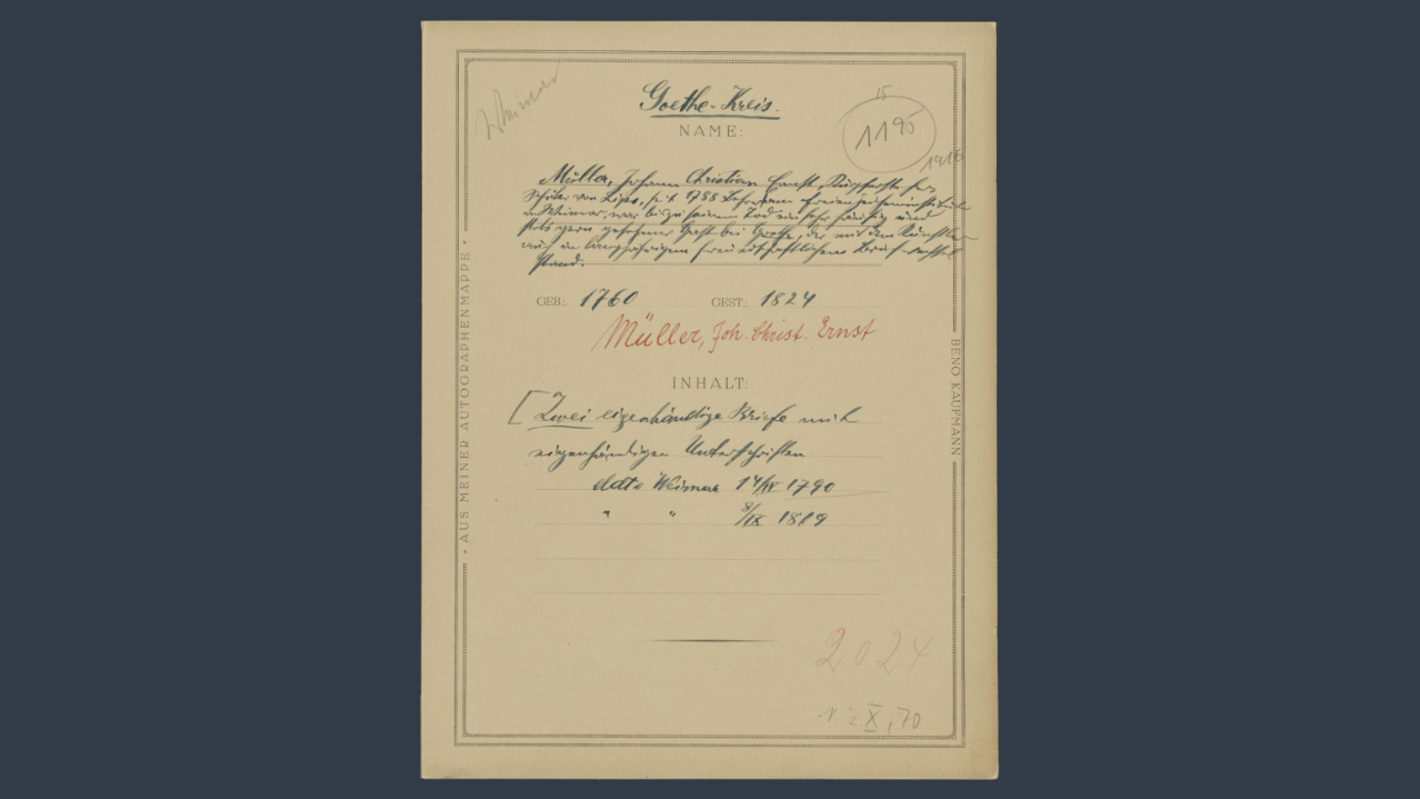 Beno Kaufmann’s manuscript collection focused on the period of Weimar Classicism. The dates on the folders show that he was still active as a collector at the beginning of the 1930s. In the effort to bring additional clues to light, researchers investigated the art world during this period, with a particular focus on Kaufmann’s area of interest.