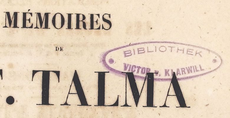 A systematical research within the holdings of Weimar’s Herzogin Anna Amalia Bibliothek for cultural items confiscated by the Nazis uncovered a four-volume work acquired in September 1939 from the Königsberg antiquarian bookshop Gräfe und Unzer. The volumes, published in 1849–1950 by Alexandre Dumas, contain the memoirs of the French actor François-Joseph Talma. Thanks to a bookplate stamp in each volume, researchers discovered that the work previously belonged to the library of Viennese bibliophile Victor von Klarwill (1873–1933). The son of a Jewish writer and journalist ennobled in 1881, von Klarwill was a translator and publisher of French-language books who belonged to a circle of book collectors that would later become the Wiener Bibliophilen-Gesellschaft, the premiere society of book lovers in Austria. He was married to Elsa Elvira von Klarwill, née Egger (1877–1945), who was also Jewish. The couple had a son, Victor Isidor Ernst (1902–1984). When Victor senior died, in March 1933, Elsa von Klarwill became the sole heir.