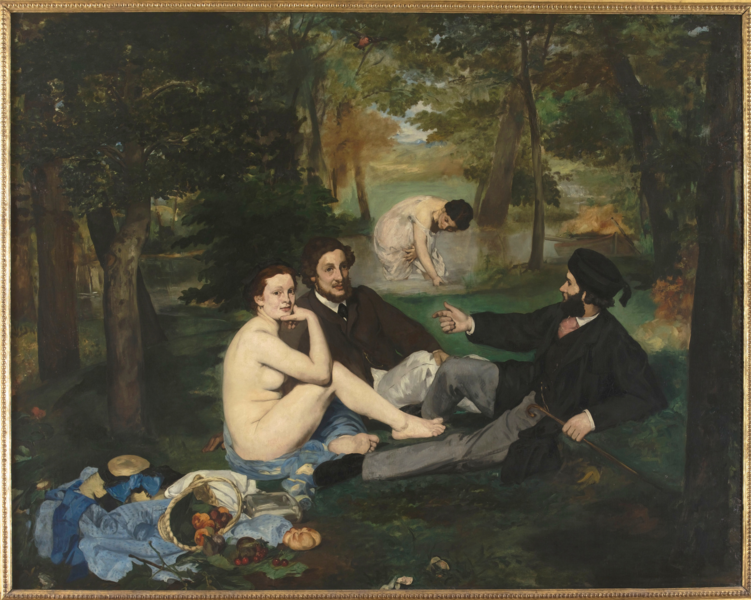 Aus heutiger Perspektive könnte man annehmen, dass Manet hier eine realistische Szene abbildet, die das Freizeitverhalten der modernen Pariser Gesellschaft vor der Jahrhundertwende zeigt. Doch dieser Anschein trügt, denn eigentlich verbirgt sich hinter der Personenkonstellation eine intendierte Provokation. Brisant ist nicht nur der harte Kontrast zwischen den beiden nackten beziehungsweise nur halbbekleideten Frauen und ihren zwei männlichen Begleitern, die vornehm wie die Dandys der Großstadt gekleidet sind, sondern auch der Fakt, dass es sich hier um eine Zurschaustellung Manets persönlicher Vierecksbeziehung handelt.
