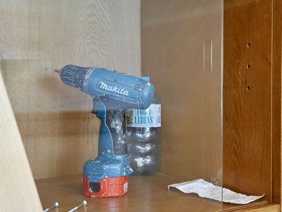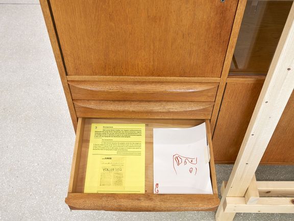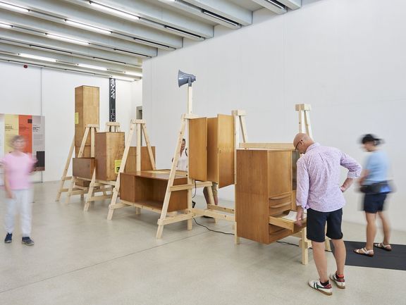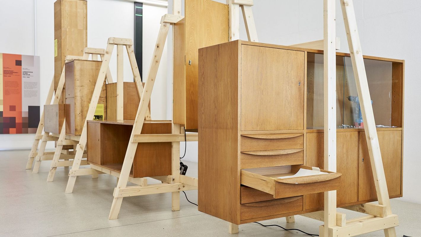 Jens-Uwe Fischer: Die Möbelstücke haben wir in verschiedenen Orten in Mittel- und Ostdeutschland gekauft, oft von den Kindern oder Enkeln der Käufer*innen. Das Spannende ist ja, dass jedes dieser Möbel nochmal eine ganz eigene Geschichte zu erzählen hat. Für die Installation haben wir sie nicht aufgearbeitet, sondern ihre Patina, ihre kleinen Fehler und Kratzer ganz bewusst belassen.