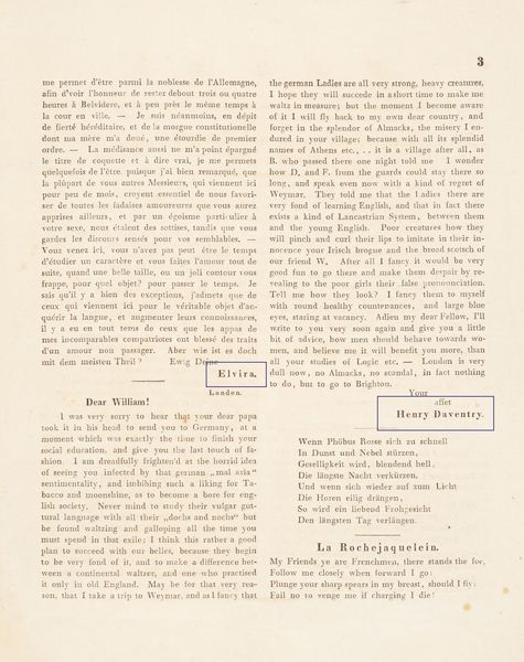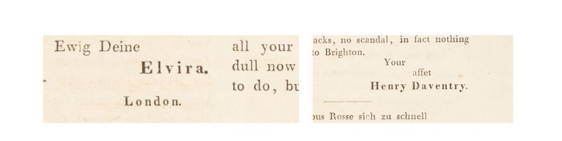 Einige der erhaltenen Chaos-Exemplare weisen Benutzungsspuren mit Notizen auf. So wissen wir zum Beispiel, dass sich hinter „Adoro“ Ottilies Ehemann, August von Goethe, verbirgt. Ottilie selbst veranstaltete gerne ein Versteckspiel und schlüpfte in die Rolle eines Engländers mit dem Phantasienamen „Henry Daventry“. Diese Tarnung gab ihr die Möglichkeit, gehörig über das „village“ Weimar zu lästern. So bedauert Daventry einen hier lebenden Landsmann, der wie alle Deutschen bald nur noch für „tabbacco and moonshine“ schwärmen würde. Und die Weimarinnen seien gewiss „very strong, heavy creatures“, die man beim Walzertanzen nur mit großen Mühen in die Luft heben könne.