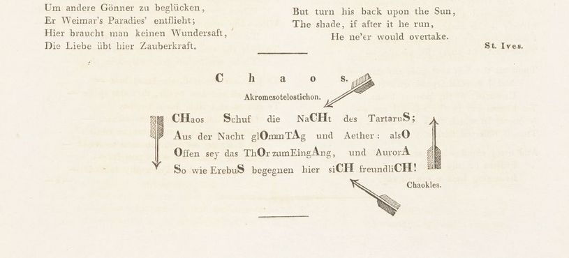 Die Zeitschrift lockt mit einem Angebot: Im postklassischen Weimar bekennt man sich, so der Unterton, zu einer Ästhetik im Zeichen von „Form und Regel“, aber heimlich lieben alle das Chaotische. „Vermummt in fremden Namen“ zu schreiben, so heißt es im Gedicht weiter, entlaste von gesellschaftlichem und ästhetischem Zwang: Name, Geschlecht, Nationalität – alles ist im „Chaos“ Schall und Rauch. Für die Romantiker stellt Chaos sogar eine ästhetische Leitkategorie dar, wie Friedrich Schlegel an anderer Stelle schreibt: „Chaos ist wohl die beste Erklärung des Romantischen“.
