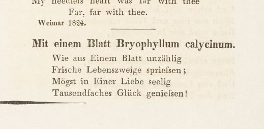 Den Vierzeiler Mit einem Blatt Bryophyllum calycinum hatte er einst Marianne von Willemer, der Mitautorin und Adressatin des Divan, gesandt. Es würde sich in seiner pointierten Symbolik bestens in das Buch der Sprüche einfügen. Und für eine Erweiterung des Buchs Suleika, den Teil des Divan, in dem Goethe Marianne von Willemers Verse platziert hatte, käme ein Gedicht in Frage, das als ein besonderes Glanzstück des Chaos gelten kann: „Das Heidelberger Schloss“ (Heft Nr. 3, 1830). Es stammt von keiner anderen als von der Divan-Autorin selbst. 1824 hatte sie es Goethe zu dessen 75. Geburtstag geschickt, dieser zog es 1830 offenbar aus der Schublade hervor, korrigierte es und gab es Ottilie für Chaos. In einer Strophe spielt Marianne von Willemer direkt auf das berühmte Gingko-Gedicht Goethes an: