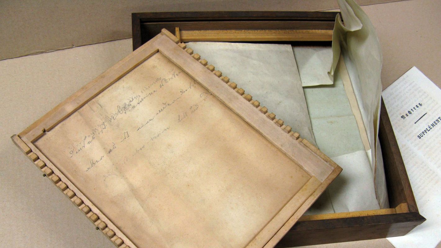 Die Suche nach einer Schreibvorrichtung für Erblindete in den musealen Sammlungen brachte zunächst kein Resultat. Erst im Zuge einer Bestandsüberprüfung des Kunstkabinetts im Jahr 2019, in der das Kästchen samt Inhalt erneut im Fokus stand, wurde offenbar, dass es sich um das gesuchte Objekt handeln könnte. Die Begutachtung des Holzkästchens und der darin angelegten Schreibproben ergab, dass sich darunter auch zwei an Goethe gerichtete Briefe des Erfinders befinden. Der erste, datiert auf den 31. Januar 1823, von Schreiberhand, der zweite, vom 9. Februar 1823, eigenhändig vom Erfinder mit der Schreibtafel geschrieben. Beide waren der Forschung bislang unbekannt — unbeachtet hatten sie 200 Jahre im Kasten der Schreibtafel gelegen.