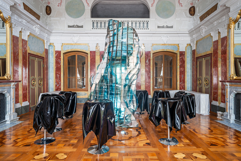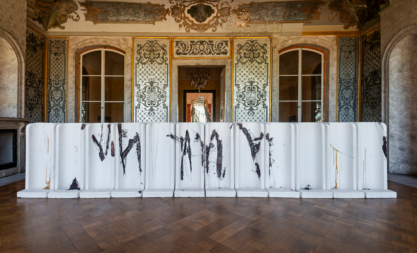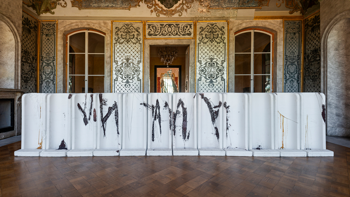 Doch dieser Gleichklang bleibt oberflächlich. Metzels Installationen und Skulpturen können ihren Status als fremdartige Störfaktoren kaum verbergen: Allein die für das 20. und 21. Jahrhundert ikonischen Materialien Stahl und Beton sowie deren teils grobe Bearbeitung konterkarieren das feine, erhabene, durchkomponierte barocke Dekor und ziehen uns gnadenlos in unsere Gegenwart. Zudem bestimmen sie aufgrund ihrer teils beachtlichen Größe den Raum und die Wegeführung. Die Installation ich hasse schule, 2010, bestehend aus von Gymnasiast*innen bekritzelten Schultischen und -stühlen, stellt sich den Besuchenden gleichsam in den Weg und blockiert die Gänge zwischen den Sälen. Man ist direkt mit den Bestandteilen der Installation konfrontiert und gezwungen, sich mit ihnen fast körperlich auseinanderzusetzen.