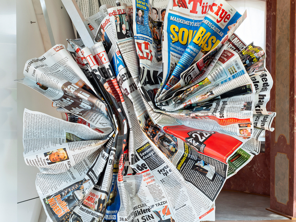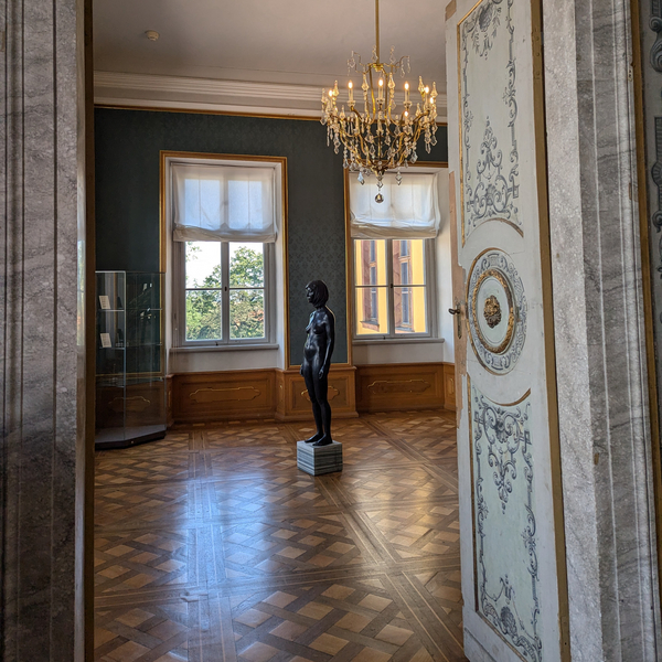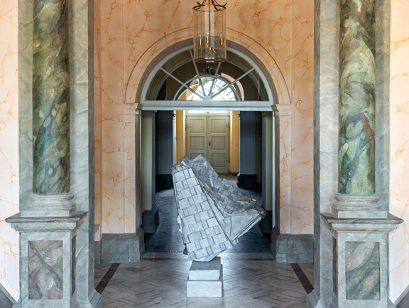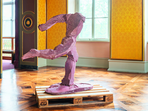 Farbigkeit und Oberflächenstruktur von Metzels Arbeiten harmonieren oder stellen sich in einen reizvollen Kontrast mit der prunkvollen Innenausstattung. Die grauen Rechtecke der Betonskulptur Berliner Kindheit, 2020, im Eingangsbereich des Schlosses, spiegeln sich in den quadratischen grauen Bodenfliesen ebenso wie im gräulichen Stuckmarmor, mit dem die Säulen hinterfangen sind. Die bunten Seiten der für Deutschstunde, 2024, in Metall verewigten Zeitungen passen besonders gut zum vielfarbigen Stuckmarmor des Westpavillions. Den Sockel aus schwarzem Marmor der neu für die Ausstellung in Weimar angefertigten Skulptur Oberkante Unterlippe, 2024, hat Metzel bewusst gewählt, „weil die Marmorwände da so dominieren“.[7] Die Skulptur Roter Beton, 1981, hebt sich besonders gut von der gelben Textiltapete ihres zugewiesenen Zimmers ab und die Holzpalette, auf der das Werk platziert wurde, mag mit einem Augenzwinkern auf den transitorischen Status dieser Ausstellung und der Raumausstattung generell verweisen, auf den auch die nun verwaisten Glasvitrinen, die in einigen der Räume verblieben sind, manifestieren. Raum und Objekt sind für die Dauer einer Ausstellung eng verbunden, oft aber eben nur temporär. Danach können die Exponate an neuen Orten wieder neue Verbindungen eingehen, die neue Botschaften senden.